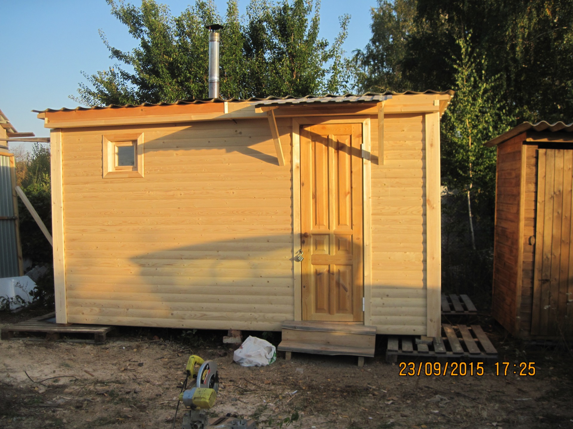 Представляем вашему вниманию компактную баню со встроенным душем. Размер в плане 2.3х4м. Предбанник 2х2.2м. Парная 2х2.2м. минус 1х1м. это душ, вход из предбанника. Любые варианты внешней и внутренней отделки. Печь и дымоход устанавливаються любые на ваш вкус и цвет.
